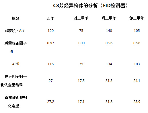 气相色谱的一些主要检测器如FID和TCD对某些组分,如同系物的校正因子相近或有一定的规律,从文献中可以查到或进行计算。当校正因于相近时,可直接用峰面积归一化进行定量分,例如下表中给出了C8芳烃异构体的分析结果。四个组分的FID检测器的质量校正因子在0.96-1.00之间,结果给出了用校正因子进行归一化法的定量结果和直接用峰面积进行归一化的定量结果。