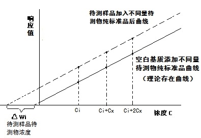 具体操作是取等量待测样品若干份,加入不同浓度的待测组分的标准溶液进行分析,以浓度为横坐标,峰面积为纵坐标绘制工作曲线。工作曲线延长线在横坐标上的截距即为样品中待测组分的浓度。由于待测组分以及加入的标准溶液处在相同的样品基体中,相当于把待测试样作为了背景值。