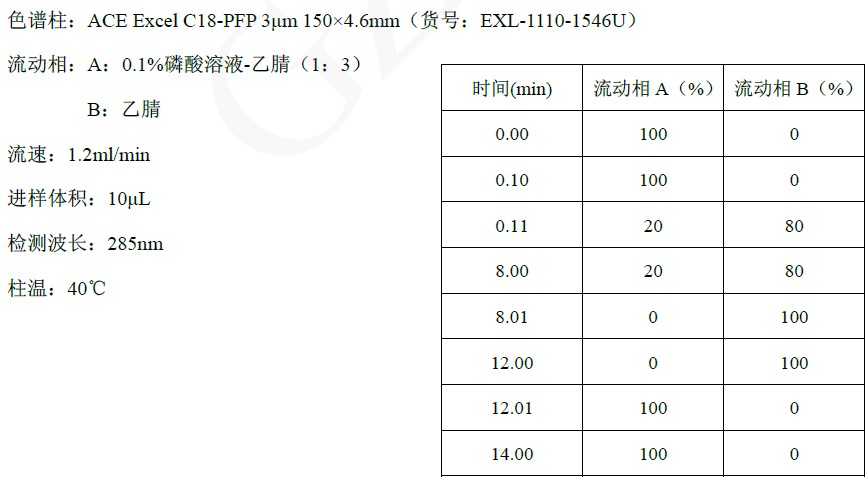 国标中用的是C30柱,水/甲醇的流动相体系,30 min的梯度方法,我们使用ACE C18-PFP,用磷酸溶液/乙腈体系,14 min的梯度方法就可以实现目标成分的分离,总体更节约分析时间。