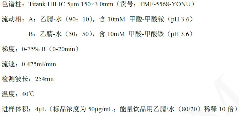 国标中用的UPLC的酰胺基柱(1.7u,150*3.0mm)或者HPLC的Si 60硅胶柱(5u,250*4.6mm),以适配不同实验室的仪器条件。