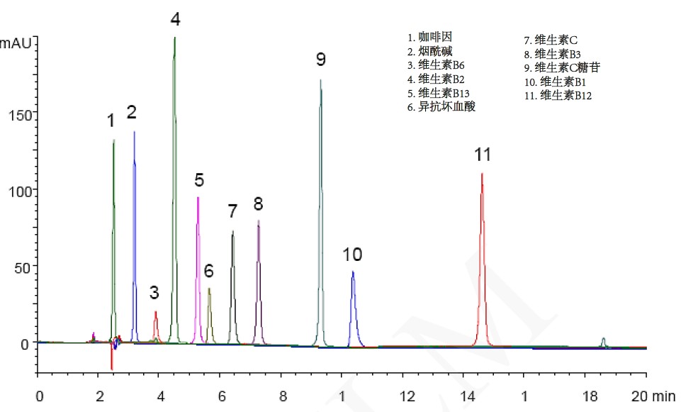 另外,对于大极性的水溶性维生素,也有用HILIC柱来分析,如使用TitanK HILIC来分析能量饮品中的水溶性维生素(混标):