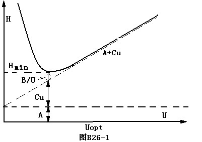图B26-1 为H-u曲线,曲线上Hmin对应最佳线速度Uopt,根据柱长L与塔板高度H的关系,理论塔板数n=L/H,在给定条件下,若在最佳流速下进行操作,可获得最高柱效。在曲线的最低点,塔板高度H最?。℉最小)。