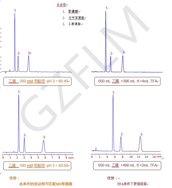 【菲罗门Comix色谱柱】苯磺酸、对甲苯磺酸和2-萘磺酸的高效液相色谱分离