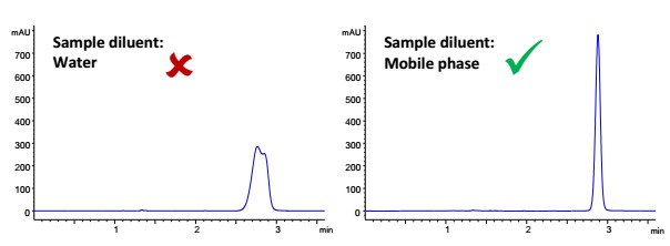 当使用亲水相互作用液相色谱法(HILIC)时,样品稀释剂的选择对峰形有显著的影响。稀释剂的错误选择可能会导致色谱峰形差,峰分裂和保留时间的不稳定。