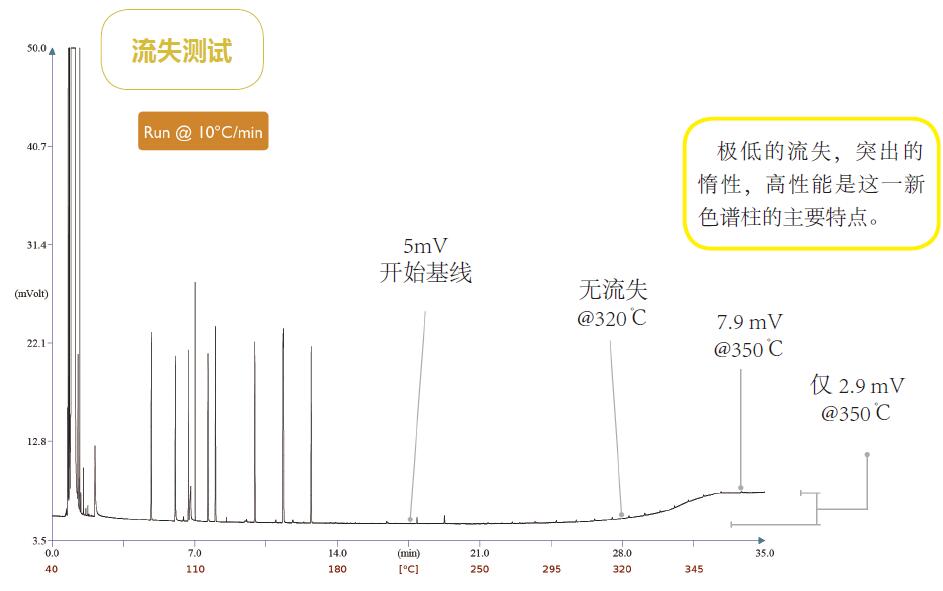 ),流失仍然非常低。色谱图显示了一个非常平坦的基线,在 320℃时没有下降,在高温 (350℃ ) 下分析