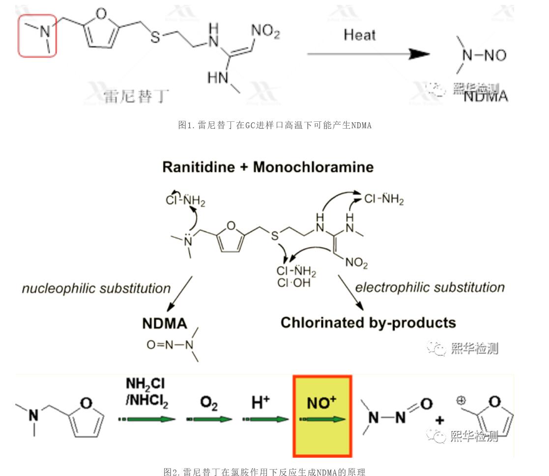 值得注意的是,有报道称雷尼替丁在使用HS-GC-MS/MS方法检测的时候,会出现假阳性结果。有研究表明,该结果是因为部分雷尼替丁样品在GC进样口的高温环境下降解产生NDMA导致(图1)。也许是冥冥之中早有定数,雷尼替丁作为一个普通的组胺H2受体阻断剂,早在2012年【1】和2014年【2】就被当作模型化合物用于研究三级胺的亚硝酸化反应(图2)。上述文献显示,雷尼替丁在氧化剂的作用下(NH2Cl,注意不是氯化铵,该化合物是一种消毒剂)作用下,能够通过一系列复杂的分子内反应生成NDMA。