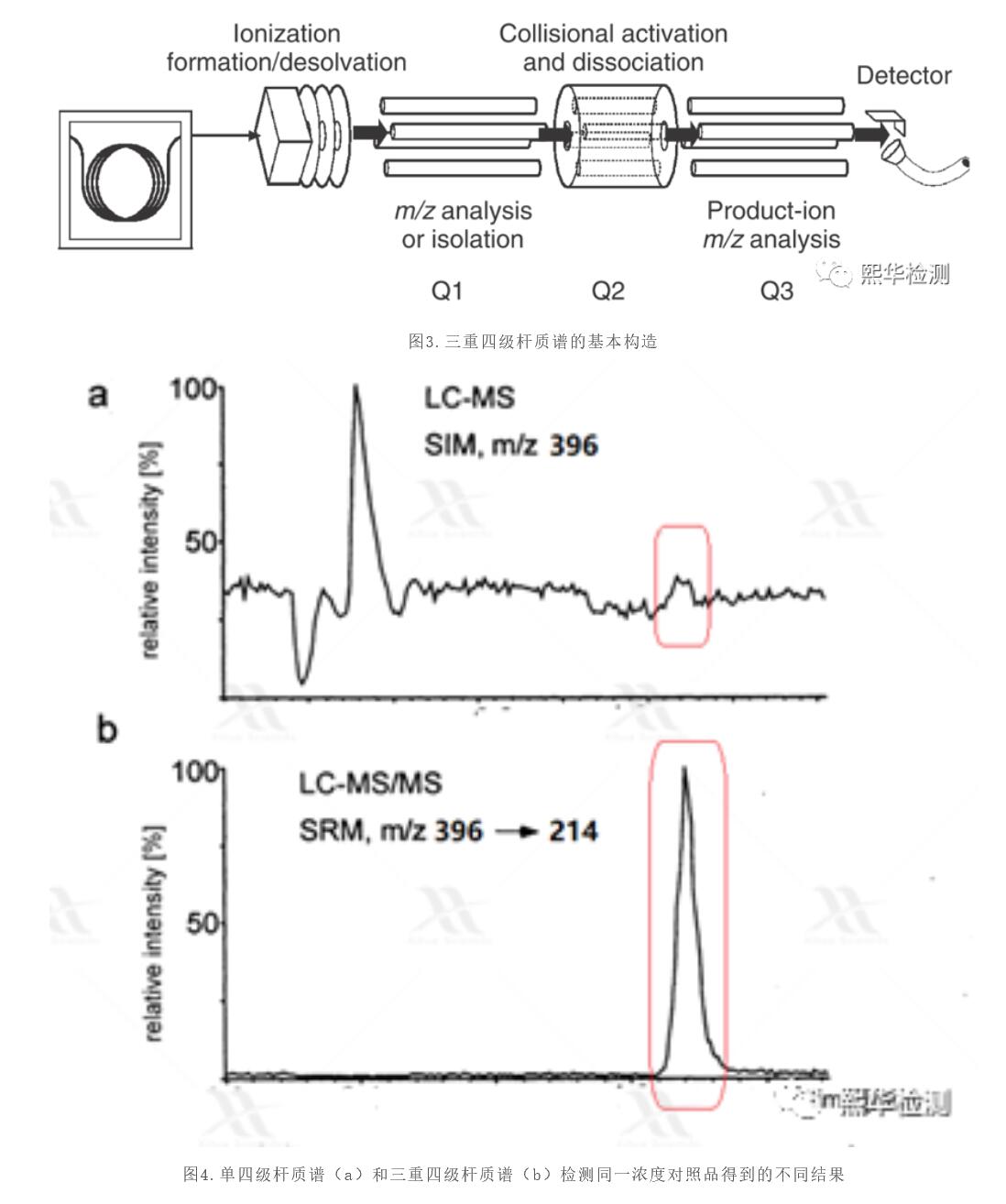 说到定量,毫无疑问,还是应该请我们分析定量界的王者-三重四极杆质谱上场。虽然属于低分辩质谱,但由于其独特的结构设计(图3),通过Q1筛选母离子,Q3筛选碎片离子来滤过干扰,大大降低了噪音信号,提高了分析灵敏度(图4)。