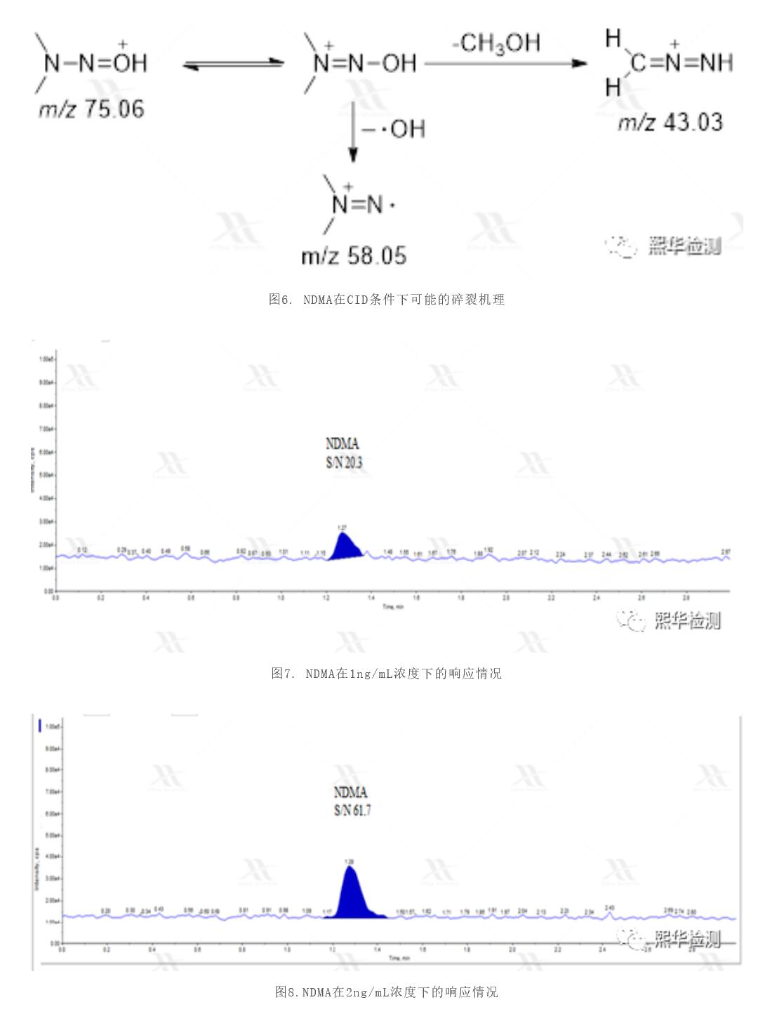 为了考察三重四极杆质谱对NDMA的检测能力,我们从几台API 6500plus液质系统(市面上灵敏度和稳定性最突出的三重四级杆质谱)中随机选择了一台并开展了试验(图5)。通过条件摸索,可知NDMA质子加合物在常规CID(碰撞诱导解离)条件下,主要碎裂为m/z 43和m/z 58两种碎片离子,推测其可能通过丢失甲醇分子以及羟基自由基【3】得到上述碎片(图6)。鉴于该原理,我们使用m/z 43为定量离子,m/z 58作为定性离子。如图7所示,使用FDA官方公布的液相条件,1ng/mL下NDMA对照品的信噪比为20.3,2ng/mL时为61.7,六针峰面积的RSD为2.5%。在有雷尼替丁及其制剂加标的情况下,回收率在90%以上,结果令人满意。但另一方面,我们发现该方法的基线噪音异常地高。这也比较容易理解,因为NDMA质子化后,质荷比只有75,非常容易受到空气、溶剂以及缓冲盐体系中小分子杂质的干扰,导致噪音较大。