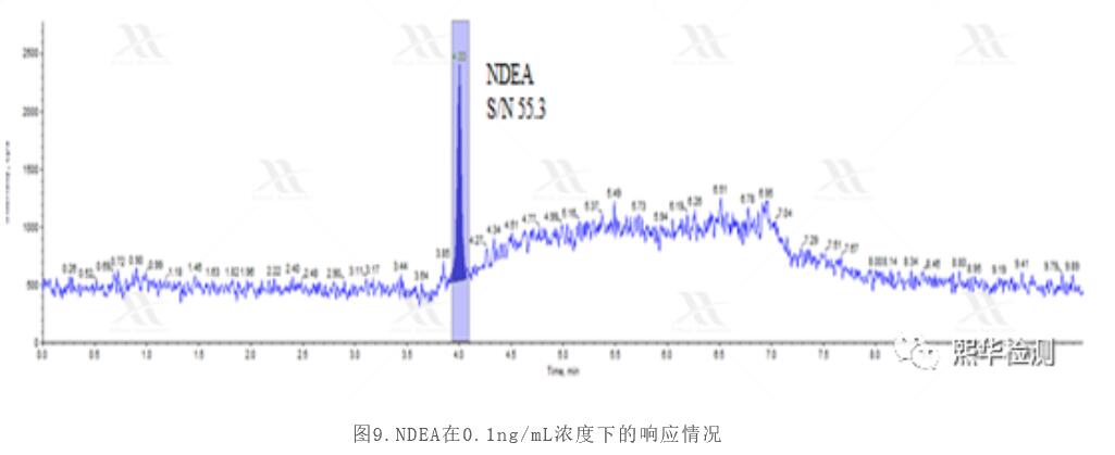 如上所述,三重四极杆质谱对NDMA的检测能力令人满意,我们相信类似的方法对于NDEA的检测效果会更佳。因为NDEA的分子量为102,受低分子量区杂质的干扰更小,理论上应该有更好的灵敏度。如图9所示,在0.1ng/mL浓度下,NDEA的信噪比达到55,证实了上述推测。