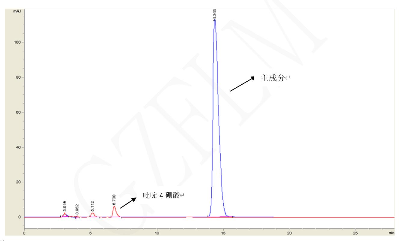 评价:增强了吡啶-4-硼酸的保留,吡啶-4-硼酸在 C18 下没有保留,且吡啶-4-硼酸与主成分不能分离。