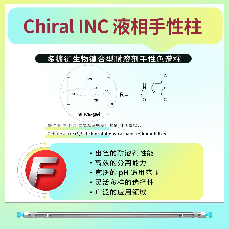 固定相:Chiral INC 键合型耐溶剂手性柱的固定相为纤维素-三-(3,5-二氯苯基氨基甲酸酯)共价键键合(Cellulose tris(3,5-dichlorolphenylcarbamate)immobilized)。这种特殊的固定相设计使得该手性柱具有优异的手性识别能力和分离效率。