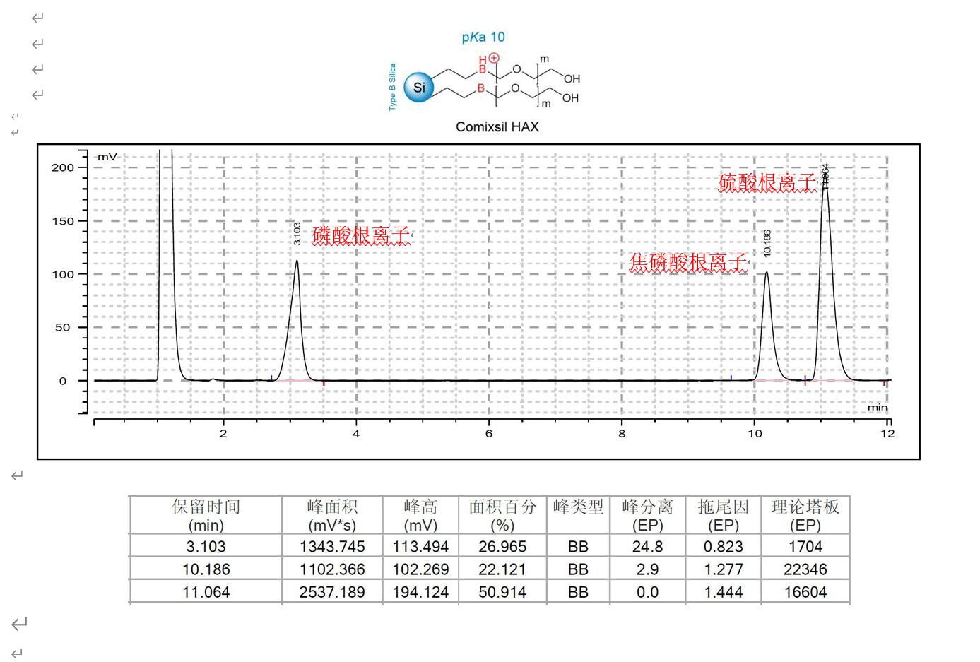 方法说明:通过 Comixsil HAX 的中等强度的阴离子交换能力保留各阴离子,通过酸的浓度调节各阴离子的保留,解决了在其他固定相上比较难解决的焦磷酸根离子的保留和峰形问题。Comixsil HAX 在高比例有机相条件下也存在强的 HILIC 作用,在本应用中,为了避免过强的保留,只发挥其阴离子交换的作用。