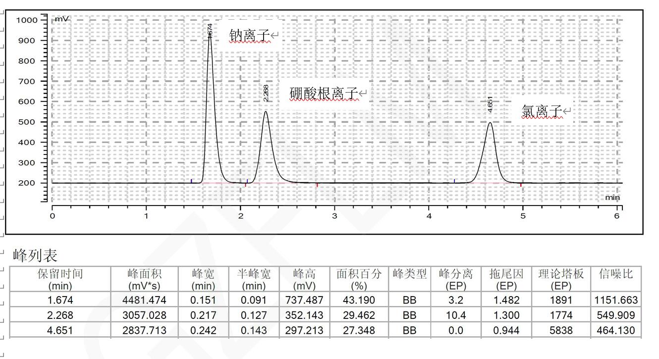 方法说明:使用 Comixsil RP-AX ,利用阴离子交换保留硼酸根离子和氯离子,钠离子由于阳离子排