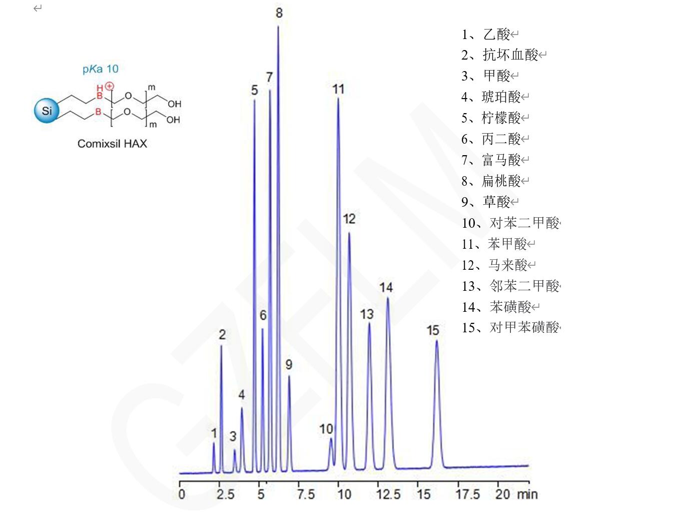 15种有机酸分析HPLC色谱柱方法说明:调节流动相的 pH 值可以有效增强或者抑制分析物以及 Comix 系列色谱柱上的基团的离子化,从而可以帮助我们更好地分离离子性和疏水性存在差异的有机酸。当从高 pH (pH 4)梯度变化到低 pH (pH 2)时,有机酸的电离逐渐被抑制,因此这些有机酸与 Comixsil HAX 上的固定相上的阳离子的交换也会逐渐减弱。由于这款色谱柱兼容 100%的水和 100%的乙腈,因此我们可以尝试使用单、双或者三梯度来获得好的分离度和峰形。