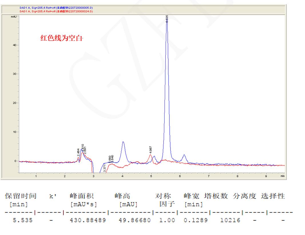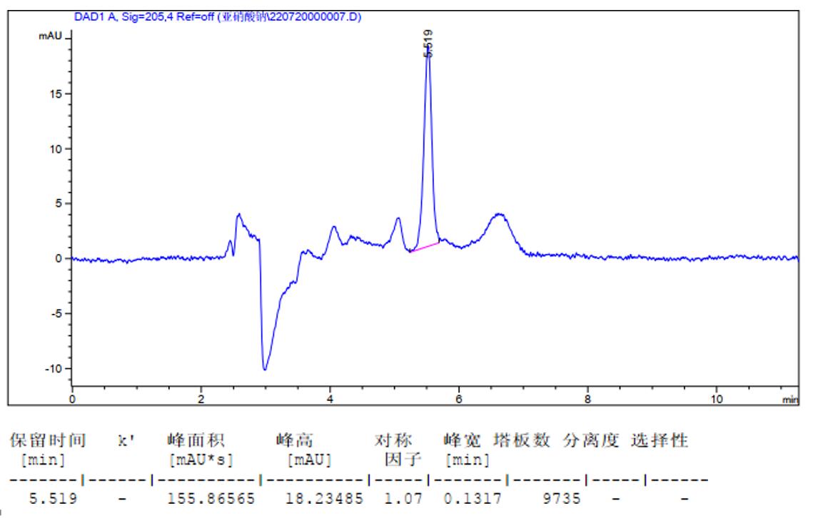 Comixsil RP-AX 在 HPLC+UV 体系,可以轻松分析亚硝根限度至 1ug/ml。根据结果,获得极佳峰形与很好柱效,实际限度可以更低(因实际需求未再考察)。(案例中杂峰因样品纯度引起)。