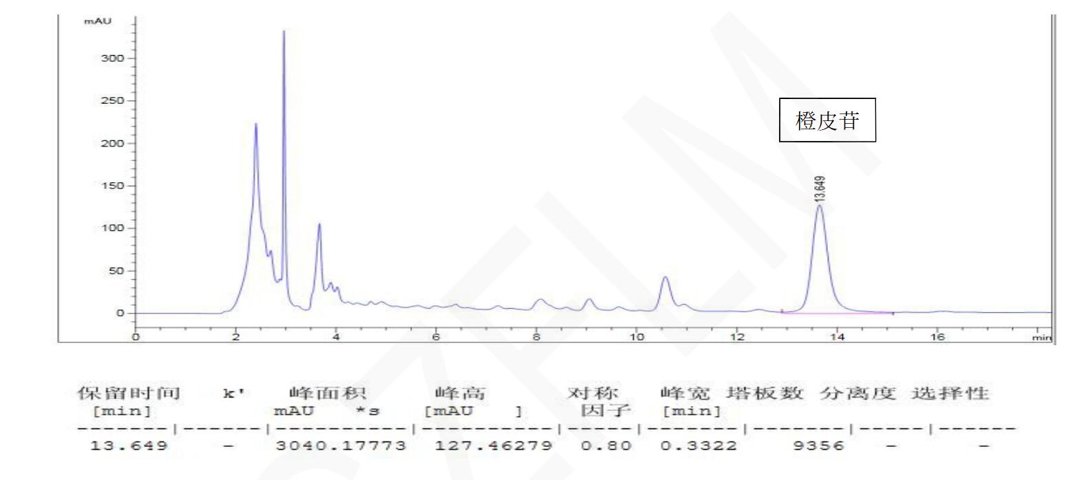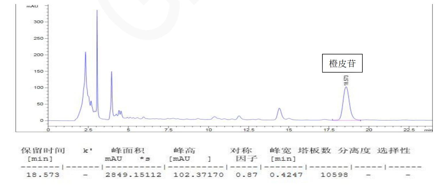 方法说明:使用 SuperLu C18 和 Superlu C18-AQ 两款色谱柱进行尝试,两者均能满足中国药典要求,需注意的是,分析橙皮苷时采用的是 20%乙腈等度洗脱,会导致一些保留较强的杂质无法洗脱而残留在柱子, 建议走完药典规定的等度出峰后,最后升高有机相比例将其余杂质洗脱出,避免影响柱子寿命及重现性。