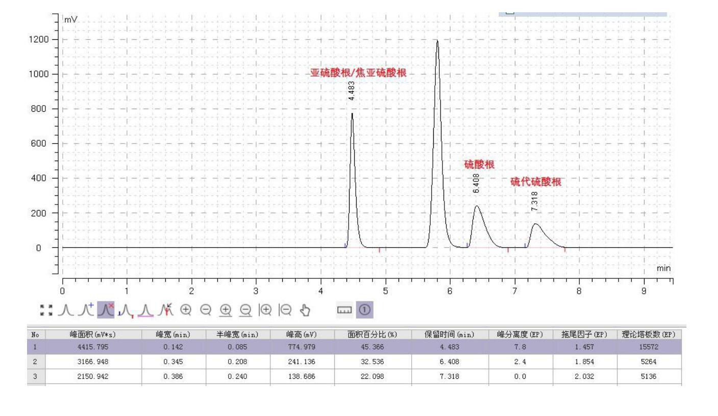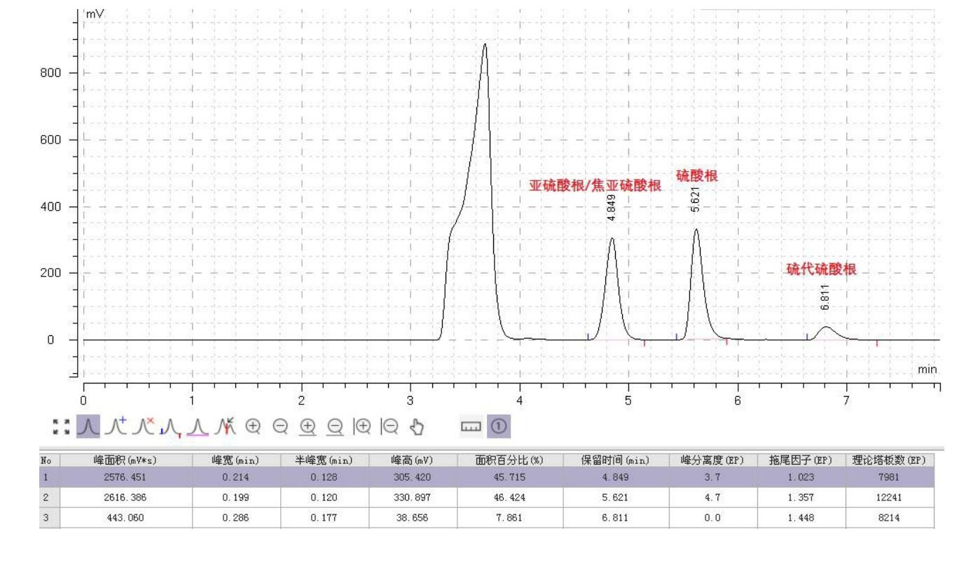方法说明:含硫原子的酸根通常酸性较强,单纯采用阴离子交换,较难洗脱且拖尾明显;采用 Comixsil ACRP 的阴/阳离子交换/排阻,可有效减弱保留,以此来改善峰型及保留;亚硫酸根及焦亚硫酸根等具有较强的还原性,在空气中易氧化为硫酸根,从而影响定量的准确性,在溶剂中加入 0.1%甲醛溶液作为抗氧化剂, 可有效抑制酸根的氧化,以此来满足定量需求。