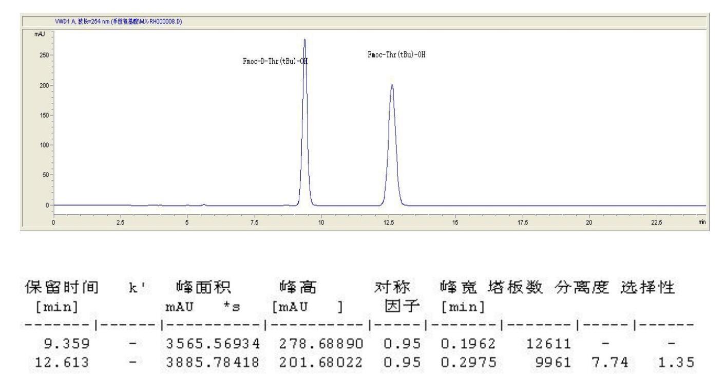 方法说明:使用 Chiral MZ(2)-RH 5u 250*4.6mm 色谱柱,简单流动相条件下成功实现了 Fmoc-Thr(tBu)-OH手性拆分。分离度大,柱效良好且峰形优秀。