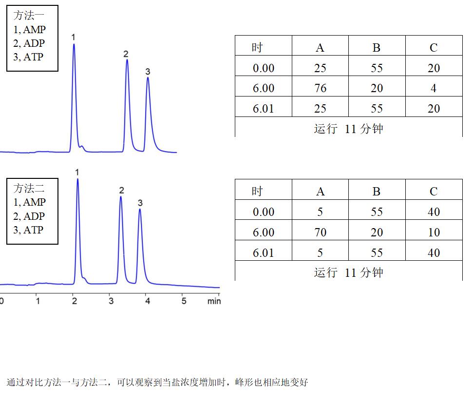 1. **色谱图**: - 通过色谱图可以直观地看到AMP、ADP和ATP的分离情况。每个化合物在色谱图上都有一个特定的保留时间,这是其身份识别的关键依据。