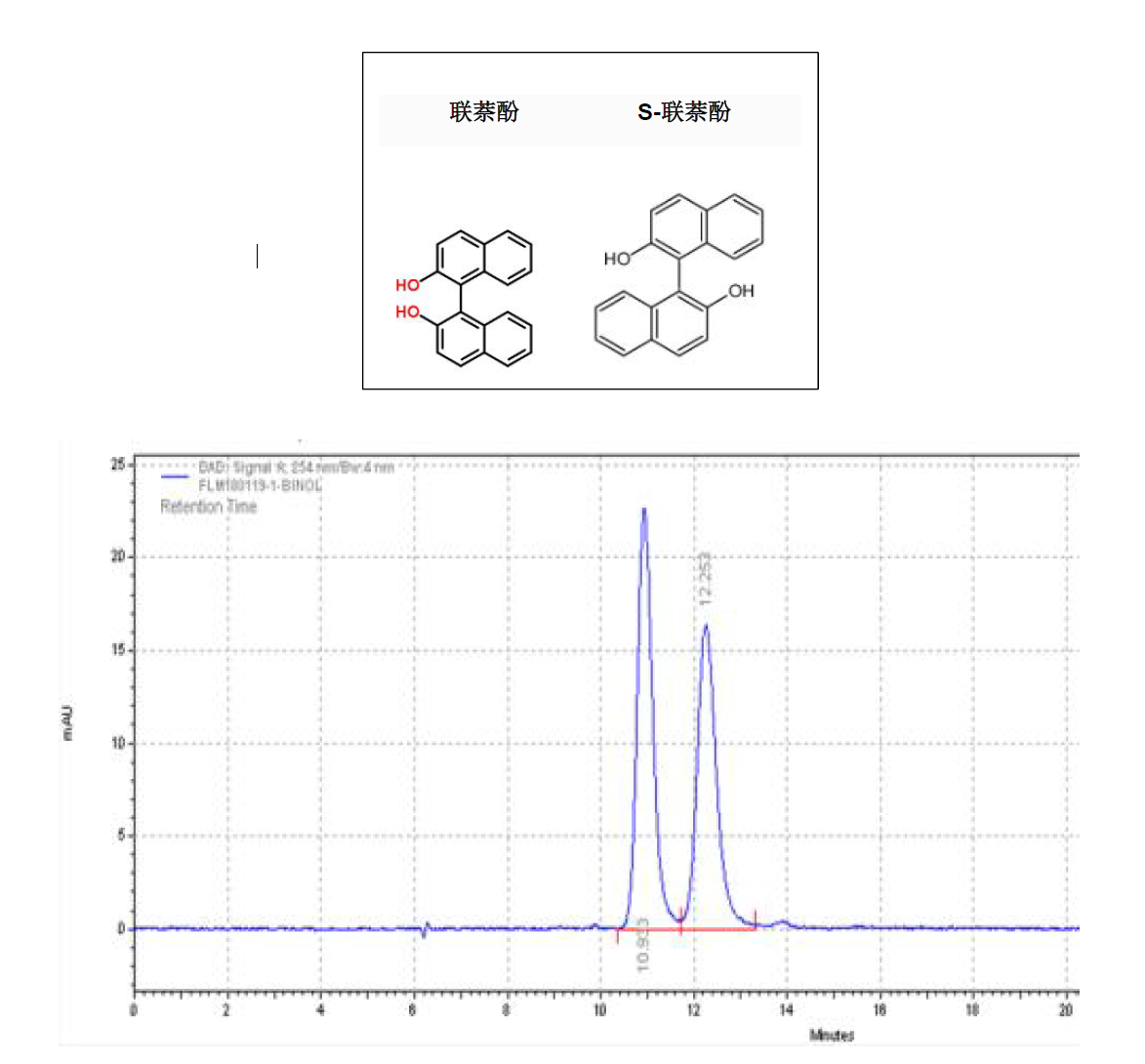 App ID: FLM-B250006 联萘酚与S-联萘酚的分离 色谱柱:Chiral INC 250*4.6mm,5um (货号:FMG-JY5-I03) 流速:0.5 mL/min 检测:波长254nm, 柱温:25°C 样品浓度:N/A 进样量:1μ 溶剂:水:甲醇=40:60(V:V) 流动相:咨询销售