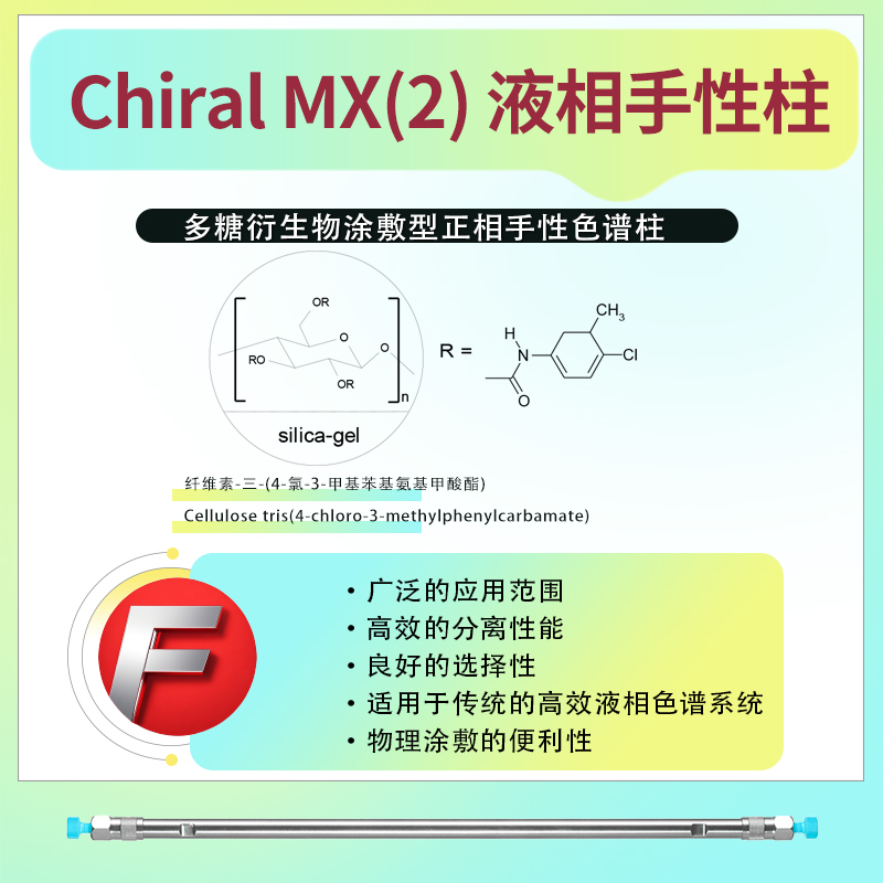 Chiral MX(2)液相手性色谱柱的固定相通常为纤维素-三-(4-氯-3-甲基苯基氨基甲酸酯)(Cellulose tris(4-chloro-3-methylphenylcarbamate))。这种固定相通过引入手性环境,使得对映异构体在色谱柱上的保留时间和分离度产生差异,从而实现光学异构体的有效分离。