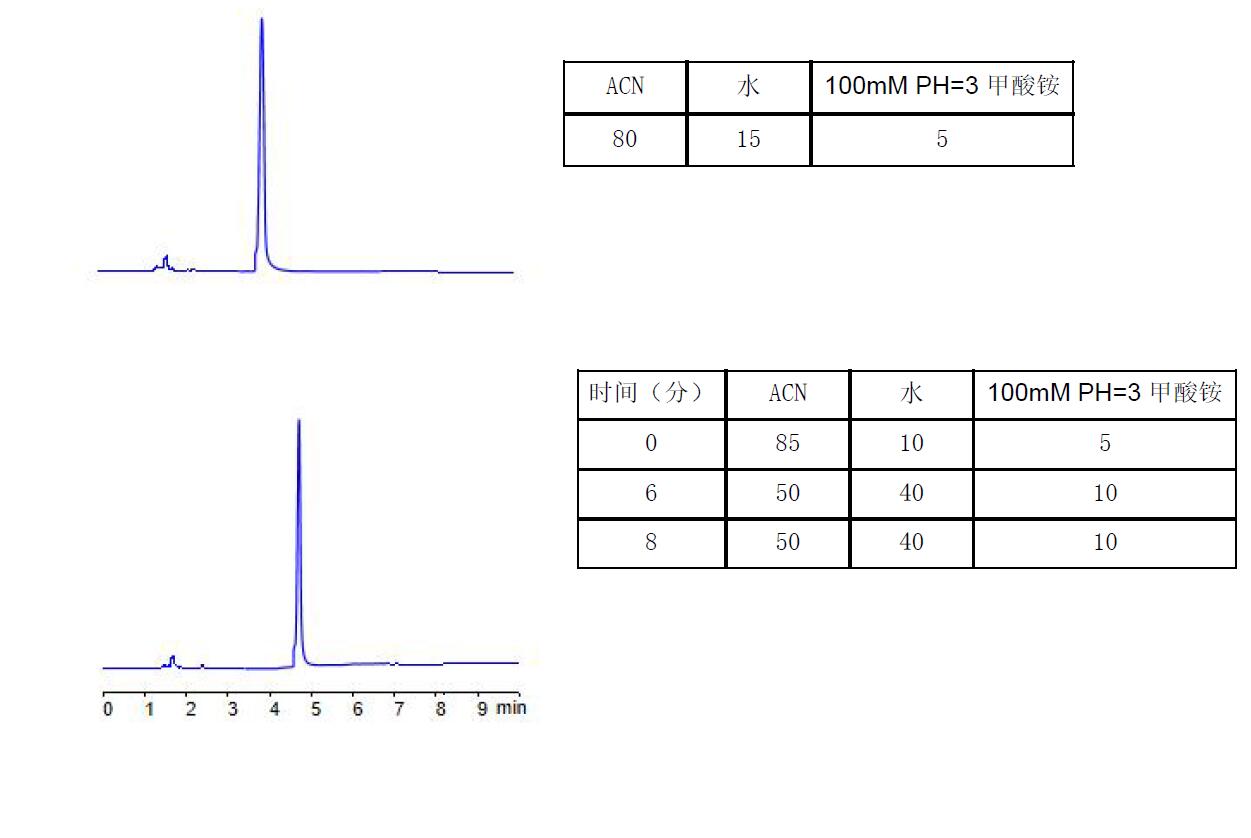 说明:以上应用可以简单在酸性体系下分析尼古丁。如果是用于MS 检测器。可选择Comxsil HAC 3u 50*2.1mm(P/N:FMB-HAC3-BONU)柱,0.2ml/min, ACN:5mM PH=3 甲酸铵=85:15,预计2min 出峰分析完毕。 该方法可避免C18 柱酸性条件下的弱保留,拖尾;避免Hilic 柱酸性条件下的重现性问题,避免不喜欢用碱性条件的客户群体。如果愿意用碱性体系的,菲罗门公司的Titank C18 柱,ACN 与碳酸氢铵的体系,也可以很好分析尼古丁,可向销售代表索取应用。 |