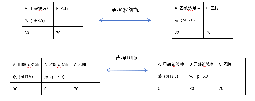 Part 2 三元泵相比二元泵的优势 1. 便于对比不同种类或pH的流动相 在开发一个新的分析方法时,通常需要筛选不同的溶剂组合以找到最佳分离效果。例如,可能需要尝试: 不同pH的缓冲液:比如甲酸铵缓冲液(pH3.5)和乙酸铵缓冲液(pH 5.0)。 不同的有机相:比如甲醇和乙腈,它们的洗脱强度和选择性不同。 对于二元泵,如果你想从“乙腈-甲酸铵缓冲液(pH3.5)”切换到“乙腈-乙酸铵缓冲液(pH 5.0)”,你必须手动更换泵B的溶剂瓶,并从泵A的瓶子中倒掉旧的缓冲液,更换新的缓冲液。这需要停机、冲洗系统、重新平衡,非常耗时且容易出错(如产生气泡、残留污染)。