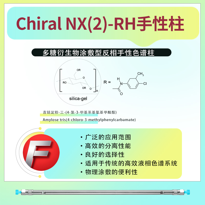 Chiral NX(2)-RH反相手性柱的固定相为直链淀粉-三-(4-氯-3-甲基苯基氨基甲酸酯)(Amylose tris(4-chloro-3-methylphenylcarbamate))。这种固定相具有独特的光学活性,能够对手性化合物进行高效识别和分离。