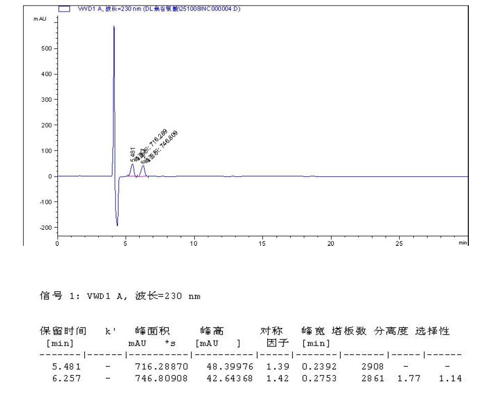 App ID: FLM-B250021 DL-焦谷氨酸的手性分析 方法:自定 色谱柱:Chiral INC 5μm 250×4.6 mm 货号:FMG-JY5-I03 流速:0.6 mL/min 检测:UV230nm 样品浓度:1 mg/mL 进样量:2 μ 流动相:咨询 色谱图: