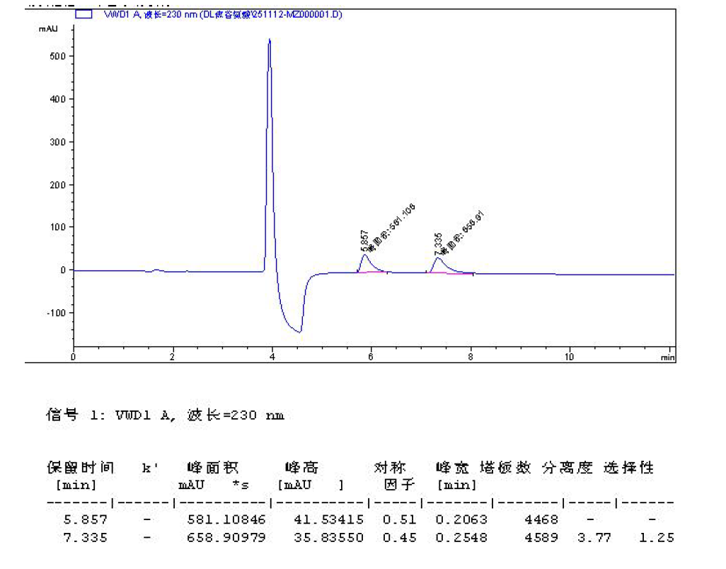 色谱柱:Chiral MZ(2) 5μm 250×4.6 mm 货号:FMG-AC5-B02-NFC 流速:0.8mL/min 检测:UV230nm 样品浓度:1 mg/mL 进样量:2 μ 流动相:咨询