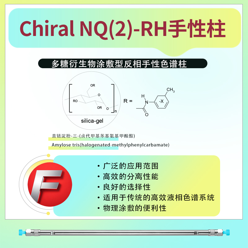 Chiral NQ(2)-RH反相手性柱的固定相为直链淀粉-三-(卤代甲基苯基氨基甲酸酯)(Amylose tris(halogenated-methylphenylcarbamate))。这种固定相的独特结构使其能够对手性化合物进行有效的识别和分离。
