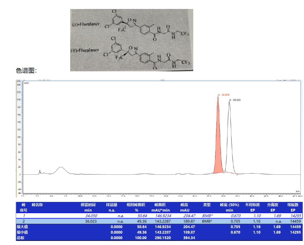 App ID: FLM-B250022 氟雷拉纳手性拆分 色谱柱:Chiral MJ(2)-RH 5μ 250*4.6mm( 货号:FMG-AC5-B03-R) 流动相及色谱条件:咨询