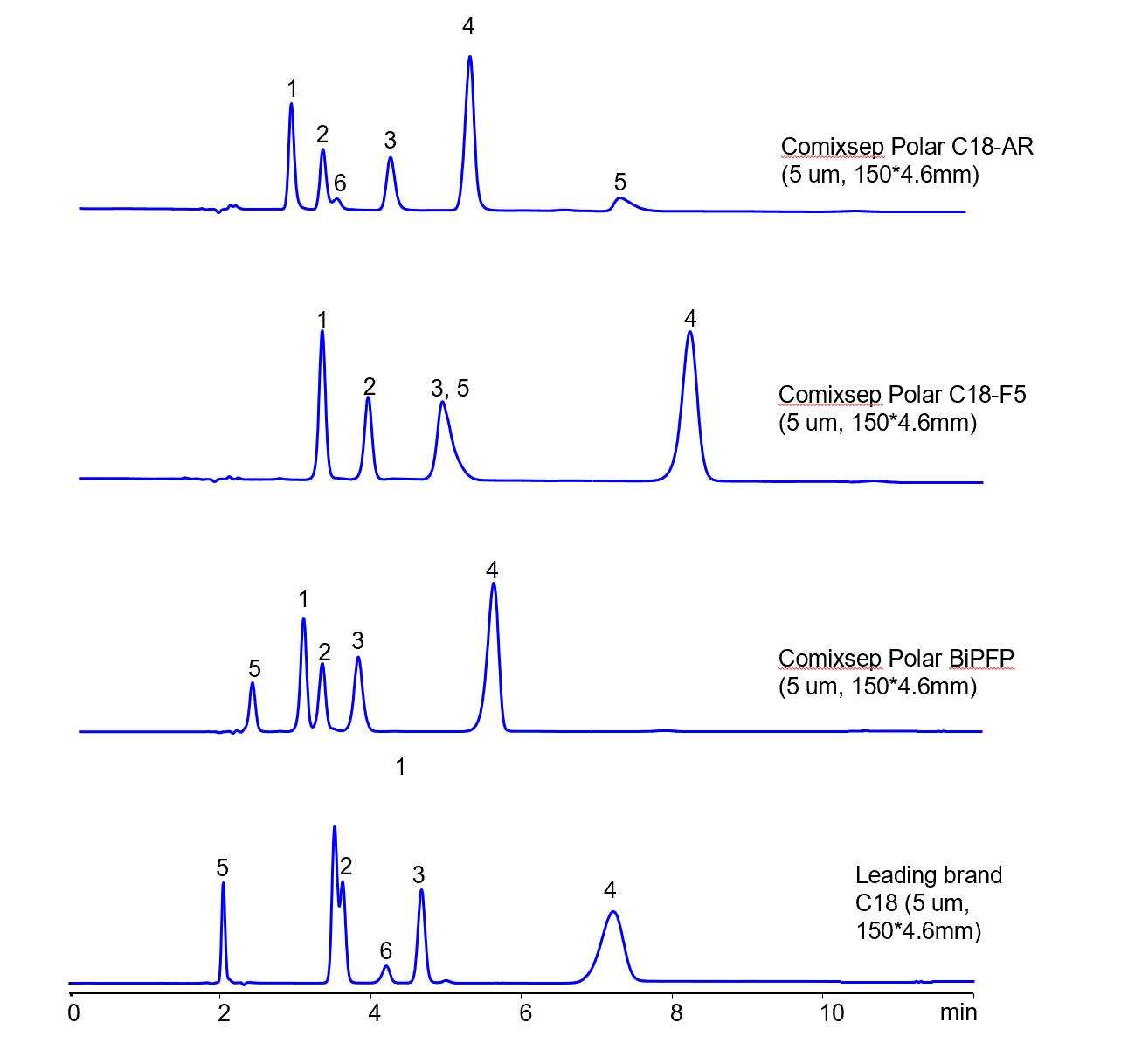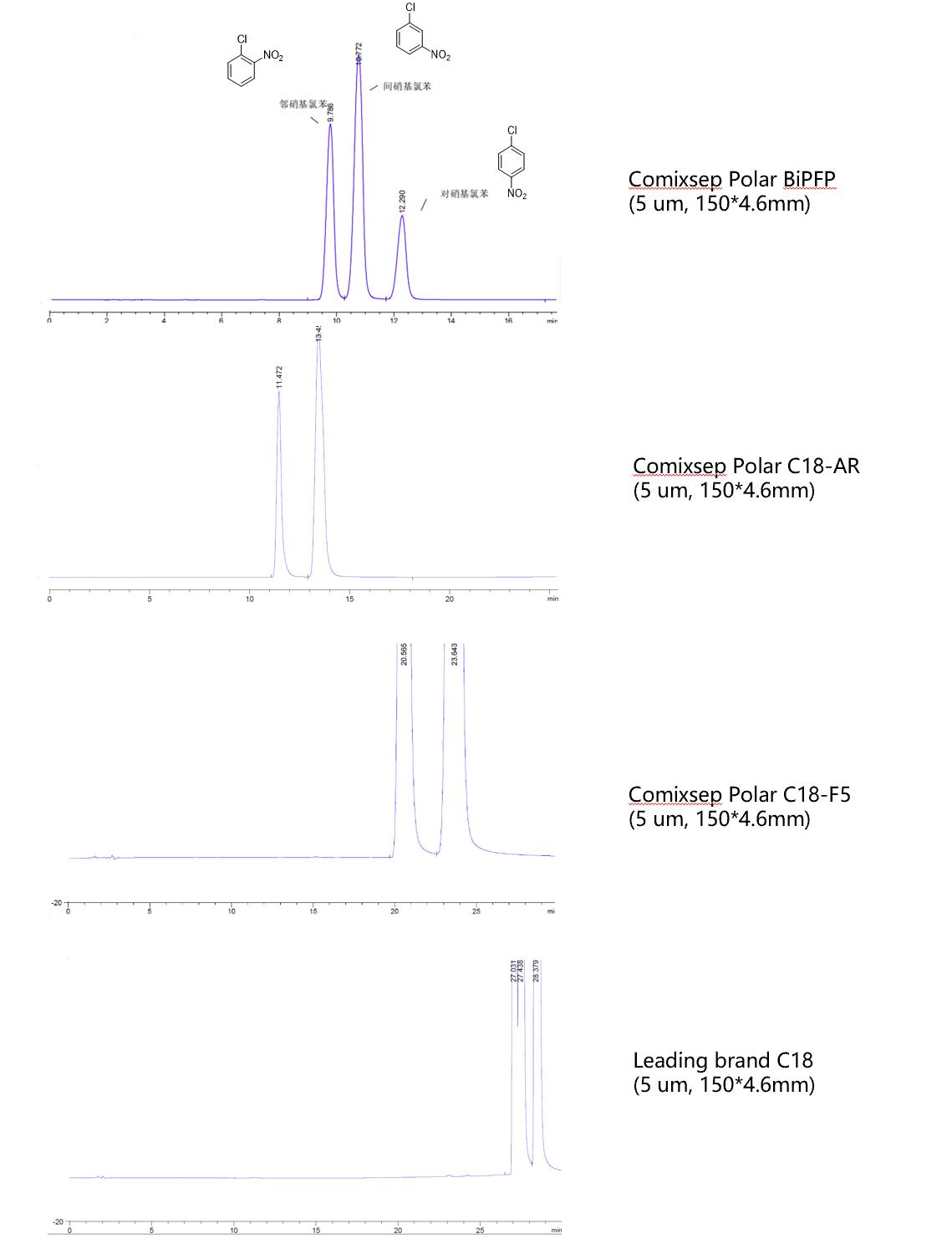 1. Comixsep系列色谱柱的分离效果在甲醇或者乙腈作为流动相中的有机相时具有很强的互补性,因此当使用Comixsep开发方法时尽量同时考察这两种有机相;