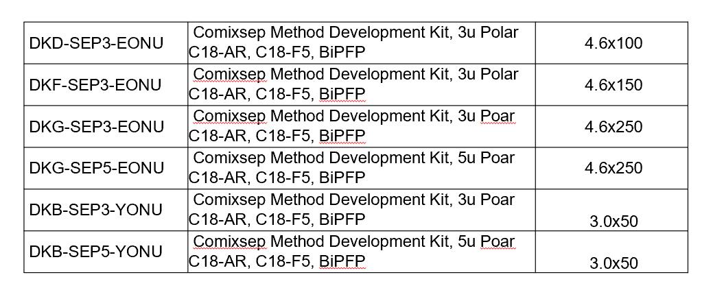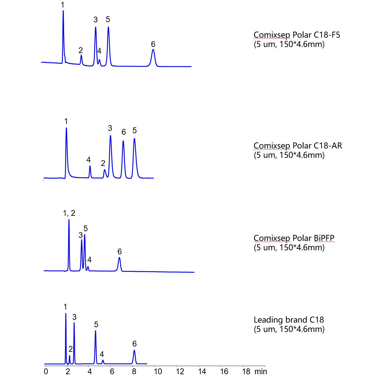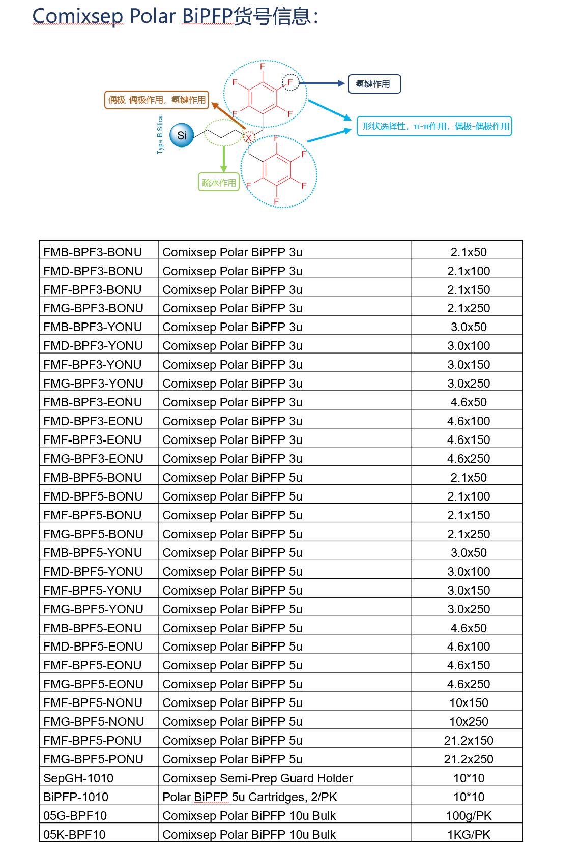 Comixsep复合反相固定相方法包为三款规格一致的互补固定相(Polar C18-F5, Polar C18-AR和Polar BiPFP)的组合,通过选择性的科学互补,方便在HPLC方法开发时固定相的筛选,最大化提升方法开发的效率和成功率,是HPLC方法开发的有力工具。