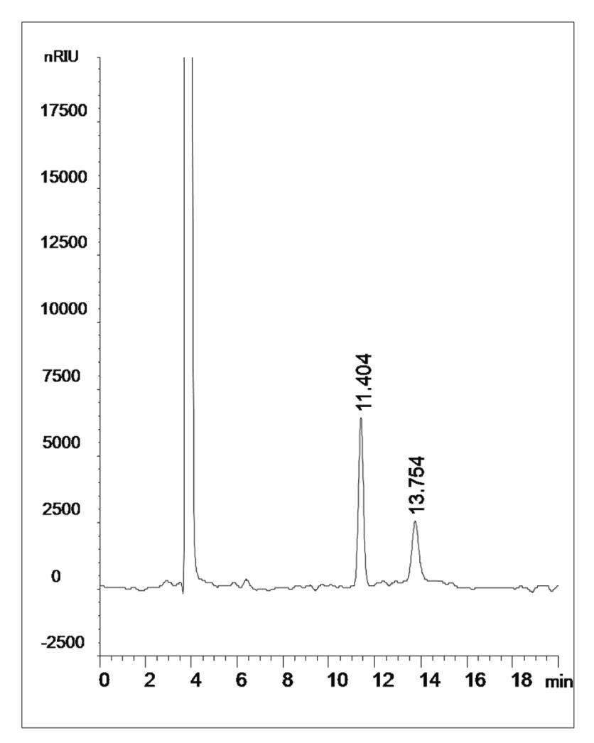 图 1: Mercury NH2 色谱柱乳糖及蔗糖标准品测试图谱 供货信息: