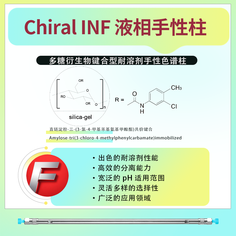 - Chiral INF 液相手性柱 Chiral INF 键合型耐溶剂手性柱是一种高性能、广泛适用的色谱柱,能够满足多种实验和分析需求。