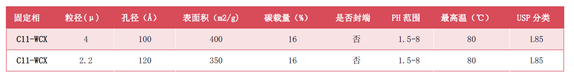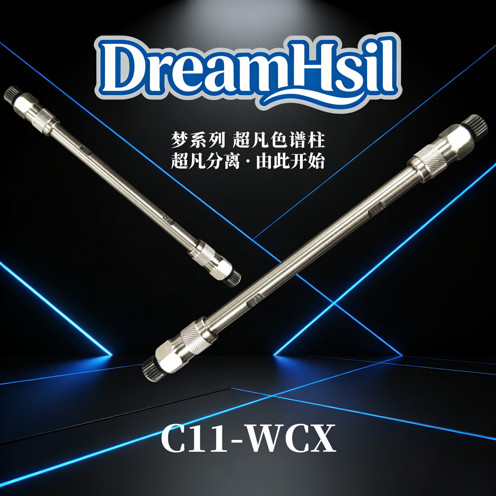 - DreamHsil C11-WCX 色谱柱 C11-WCX具有独特的选择性。采用独特键合技术,将直链十一碳酸直接独立的双位点键合于Si-H 键上直接形成Si-C键的C11-WCX键合相。