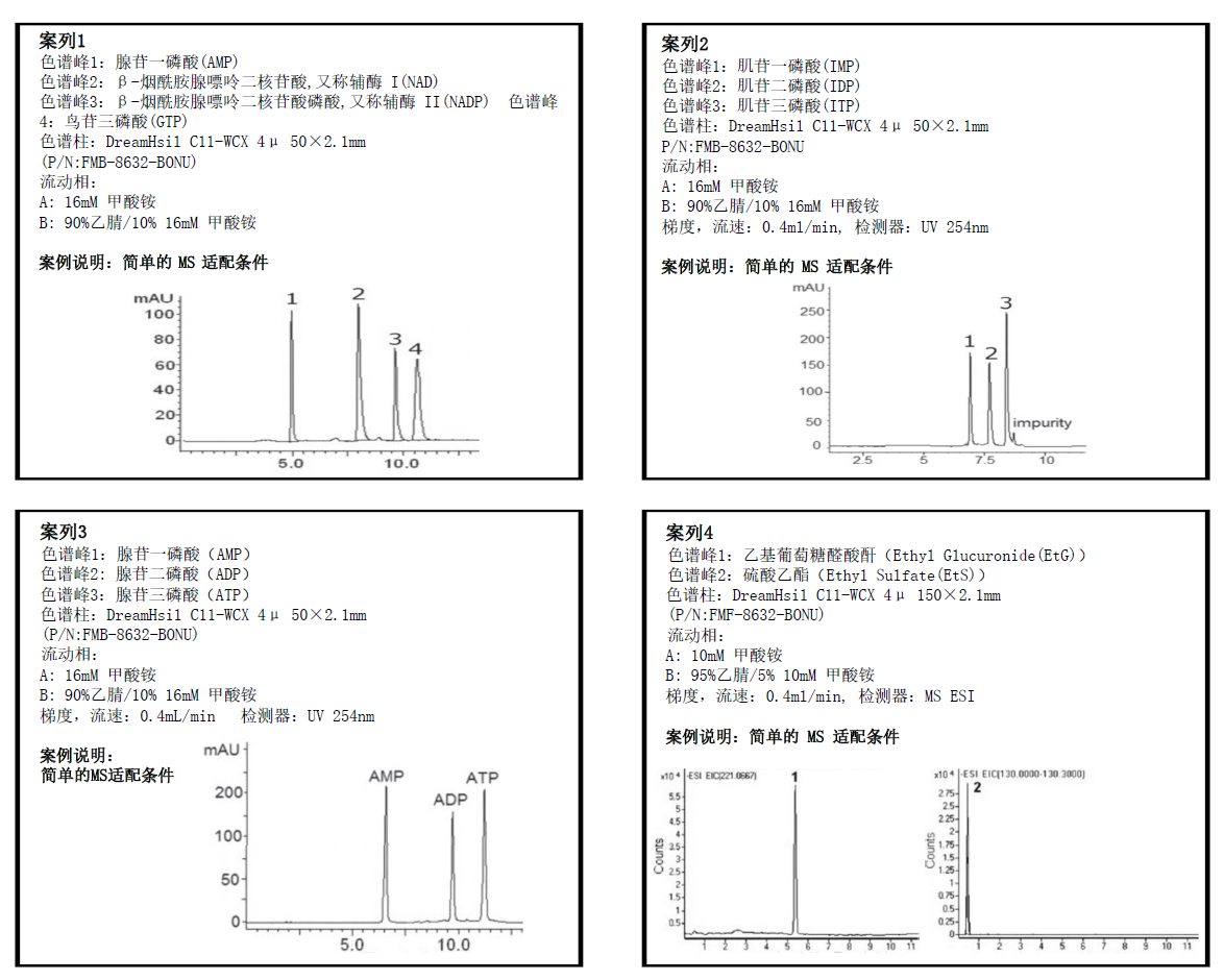 当流动相的pH高于6时,羧基 90%电离成带负电基团,而PH在6.9以上时,几乎全部电离,此时,可以主要考虑它的阳离子交换作用。 DreamHsil C11-WCX 色谱柱是分析人员用LC-MS分析相似物质时的一个好选择。