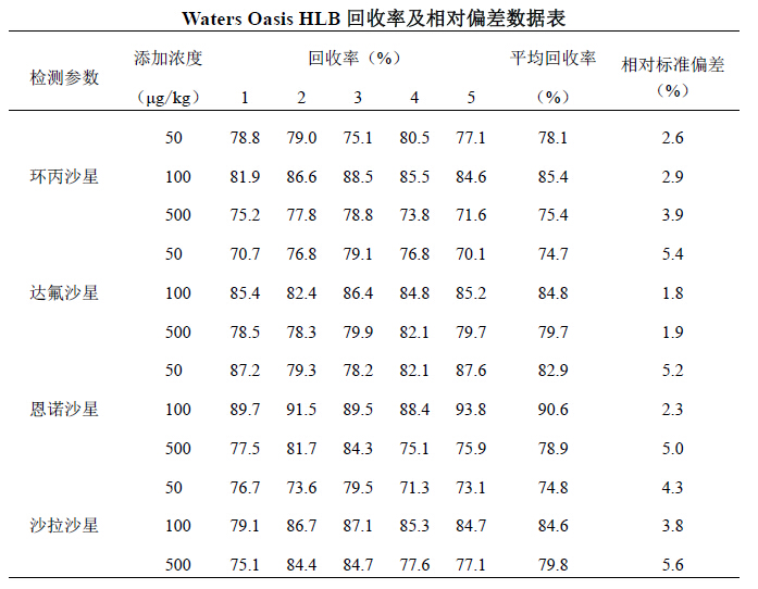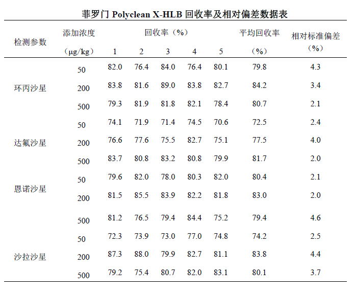 对照组采用菲罗门公司PolyClean X-HLB 60mg/3ml 与Waters 公司Oasis HLB(60mg,3cc)固相萃取柱,其余步骤相同。