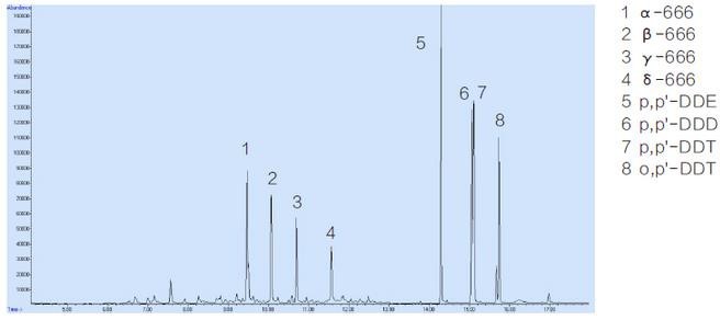 八种农残标准品:α-666(CAS: 319-84-6),β-666(CAS: 319-85-7),γ-666(CAS: 58-89-9), δ-666(CAS: 319-86-8),p,p'-DDE(CAS:72-55-9),p,p'-DDD(CAS:72-54-8),