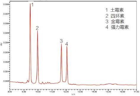 图1 添加水平为0.8mg/kg牛奶基质中四环素检测色谱图