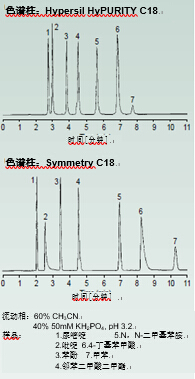 Symmetry C18 和 Hypersil HyPURITY C18 都是新一代固定相。你将期望他们提供相似的性能, 在某些情况下确实如此。然而,在这里给出的例子中,您可以看到峰保留时间、选择性、甚至峰形的差异。