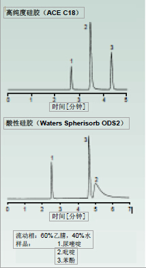 新型高纯度硅胶通常比较老的、更具酸性的硅胶更能为碱性化合物提供良好的峰形(参见图2)。
