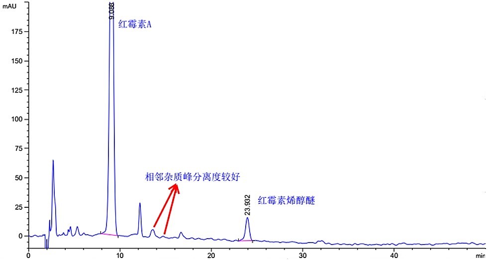 Titank C18 色谱柱分离度可达 20.19,拖尾因子 0.912,且对一些相邻杂质峰有更好的分离效果。