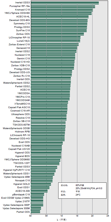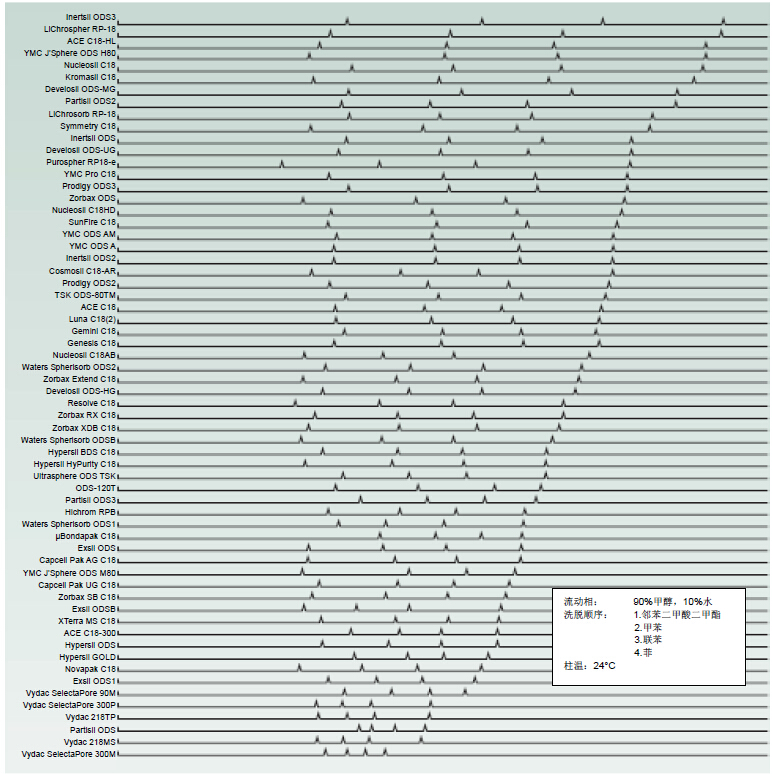需要注意,依据对甲苯的保留顺序列出的C18相与依据对菲的保留顺序列出的C18相略有不同。