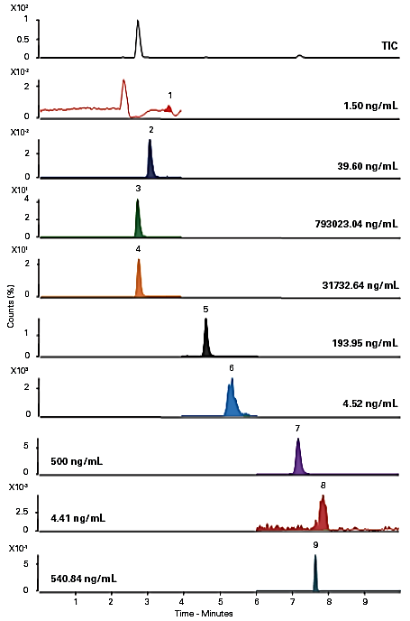 样品:大鼠脑组织样品加入甲酸水溶液匀浆处理,离心,然后用乙腈沉淀去除蛋白