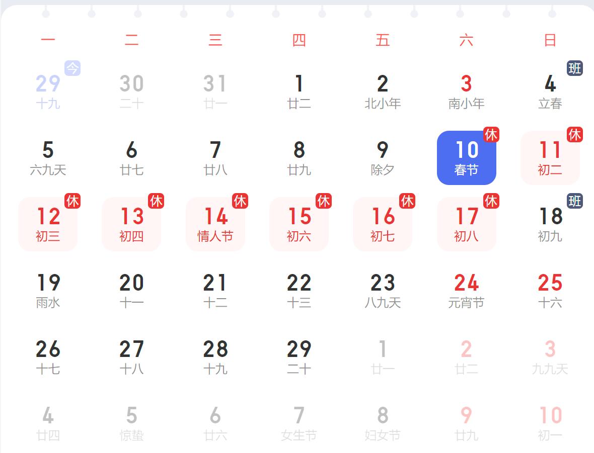 2月10日至17日放假调休,共8天。2月4日(星期日)、2月18日(星期日)上班。