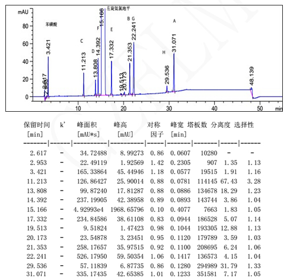 注:色谱图中的A、B、C、D、E、F、G、H 均为杂质