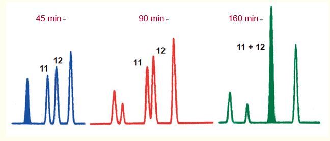 当洗脱时间增加至90分钟时,多肽11和12间的分辨率降低;而当洗脱时间增加至160分钟时,出现共洗脱峰。