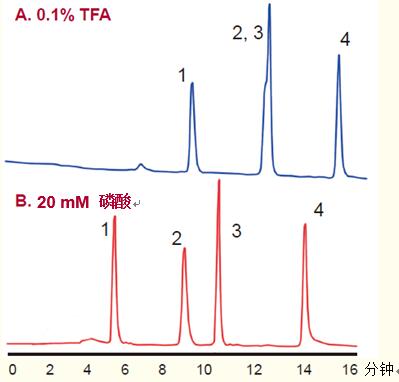 尽管同TFA一样,磷酸盐缓冲液使用的pH通常较低,但磷酸盐缓冲液也能适应较高的pH,为选择性和分辨率的改变提供了机会(见17页)。